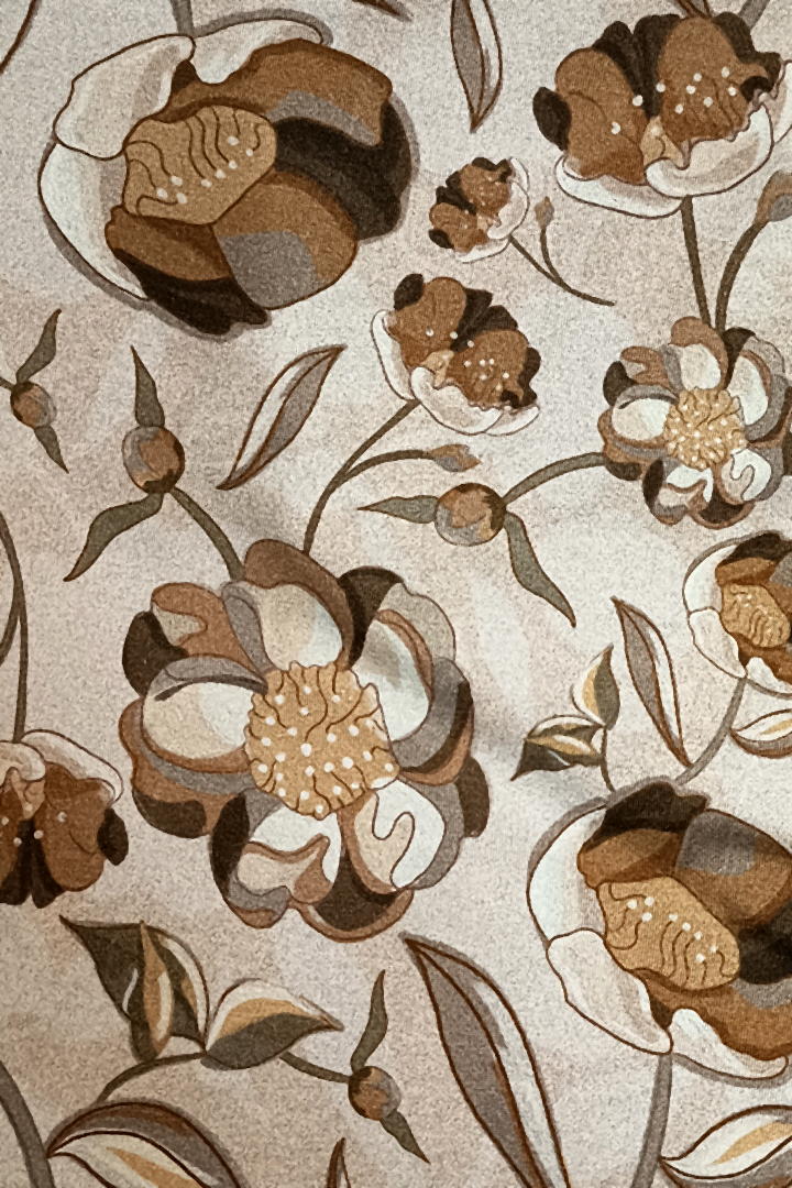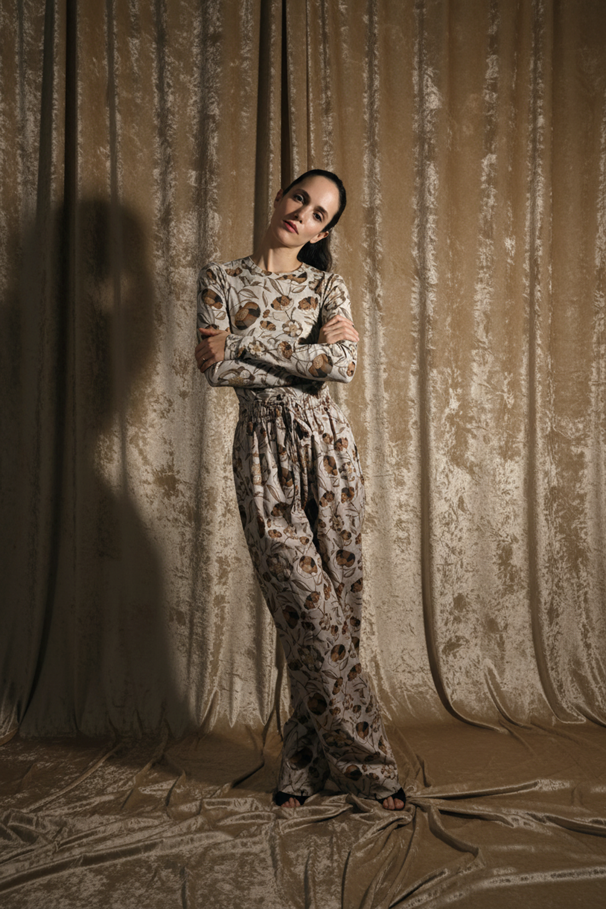 This long-sleeve top in stretch cotton jersey blends softness with subtle drama. Its body-hugging shape contrasts beautifully with its gentle pattern, evoking a garden-inspired reverie that feels both grounded and ethereal.